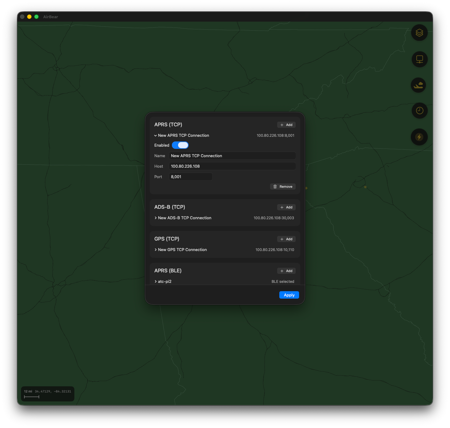 Configure connections in AirBear using the Connection Settings screen, which is accessible from the navigation buttons on the right side of the map. A TCP connection just requires the hostname. Each connection is pre-configured with the default port number.