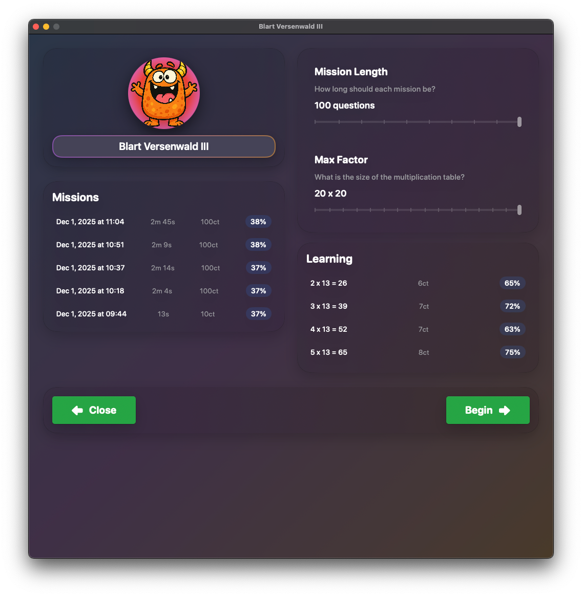 The new "Learning" section shows you which problems you have not yet "mastered" (by various metrics). You should always have several not-yet-mastered problems in this list (up to reaching the limit of your configurable Max Factor).