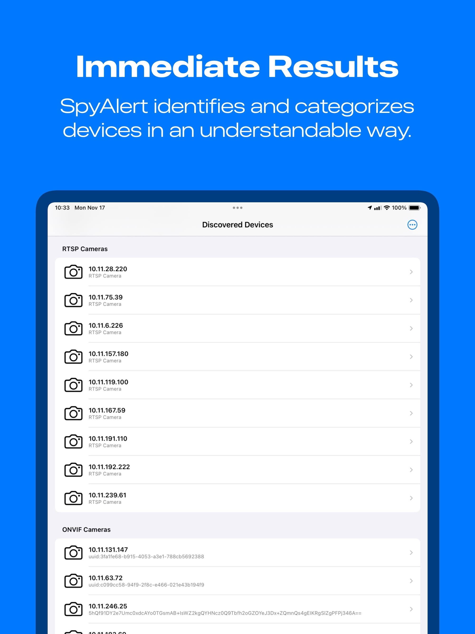 Checking into a hotel, vacation rental, or guest room? Before you unpack, scan the network. SpyAlert discovers cameras connected to the same Wi-Fi network you’re using, so you can decide whether a space is truly private.